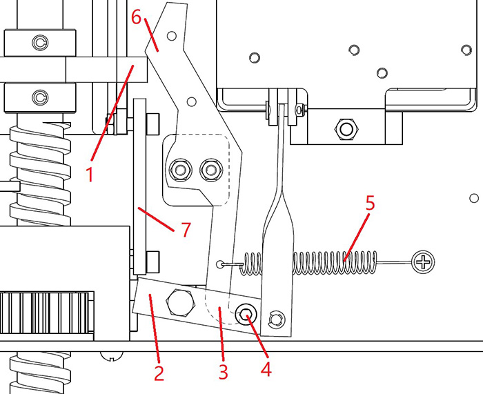 當電動底盤車移動到工作位后,絲桿上的撥塊1會通過頂板7壓下連桿2使對應的輔助開關狀態變閉合,同時掛鉤3會在拉簧5的作用下鉤住連桿2上的銷4使輔助開關一直保持在閉合狀態。